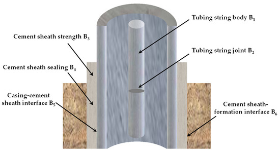 - Cement sheath–formation interface B6. Similar to the casing–cement sheath interface, the stress state of the formation is bound to change due to a large quantity of CO2 accumulation in the sequestrated area. The corresponding influencing factors of the cement sheath–formation interface are also crack length C15, crack width C16, and crack initial leakage pressure C17.