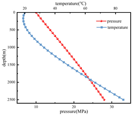 The depth of Guantao Formation in the X gas field is 2000–2900 m. The depth of the CO2 injection well is 2500 m. The wellhead injection pressure is 10 MPa, and the injection temperature is 20 °C. The iterative method was used for programming. The calculated temperature and pressure distribution along the wellbore are shown in Figure 3. Under the injection condition, the bottom hole pressure is 28.01 MPa and the bottom hole temperature is 85.12 °C.