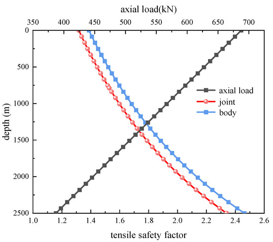 As can be seen from Figure 4, Figure 5 and Figure 6, the maximum tensile load on the tubing string joint occurs at the wellhead position. The tensile safety factor of the tubing string joint at this position is 1.32. The maximum internal pressure occurs at the bottom of the hole. However, considering the annulus pressure, the relatively weak position occurs at the wellhead. The tubing string joint has an internal pressure safety factor of 1.92. The maximum external pressure occurs at the bottom of the hole. The tubing string joint has an external pressure safety factor of 1.27.
