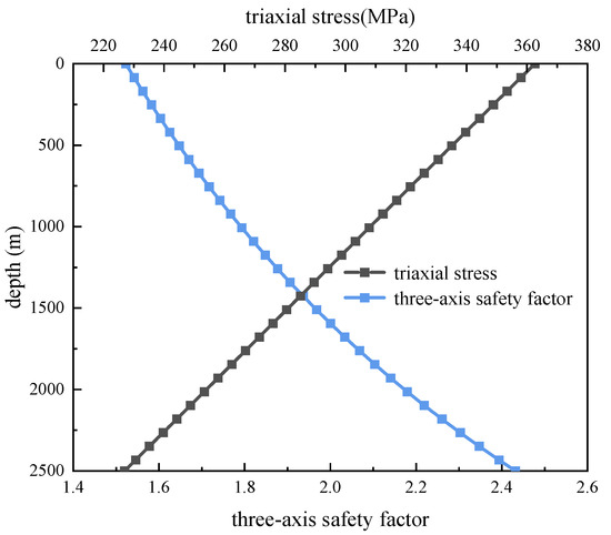 The triaxial stress of the tubing string is calculated as shown in Equation (1). The equivalent stress on the inner wall of the tubing string is calculated according to the fourth strength theory.