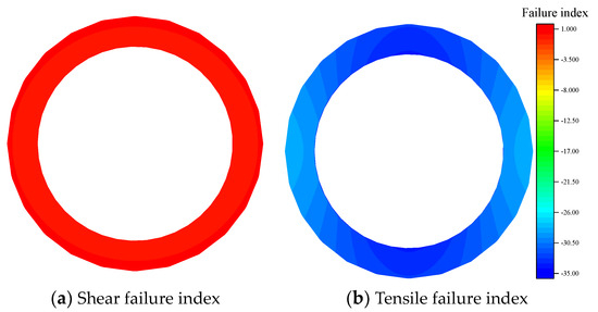 In the process of CO2 storage, the cement sheath around the wellbore is one of the most important barrier units in the well [28]. Due to mechanical failure in high-pressure fluid injection wells, cement sheaths may experience strength failure [29]. The adverse effects of cement sheath failure include lost production, potentially dangerous rigs, and lost revenue from production operations. According to the actual working conditions of the test area, the analytical solution analysis model is established. The radial and circumferential stress distribution of the cement sheath is obtained, as well as the corresponding shear and tensile failure indices distribution. The shear and tensile failure indices of cement sheath are defined by Equations (5) and (6), respectively.
