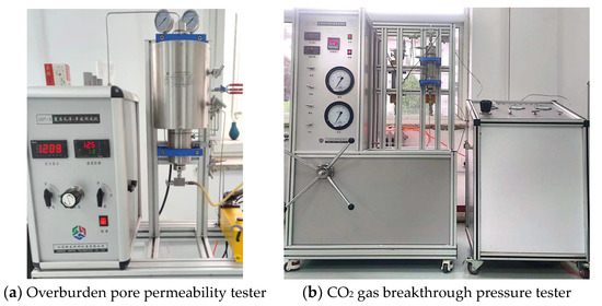 As shown in Figure 10, the UST-3 overburden pore permeability tester and UTP-03C cement stone CO2 gas breakthrough pressure tester were used to test the permeability and breakthrough pressure of the cement stone after CO2 corrosion, respectively. The confining pressure value was 23 MPa according to the field working conditions. The test results are shown in Table 1.