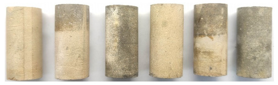 The cement used in this study was G-grade oil well cement. The cement stone was corroded by the formation aqueous solution containing supercritical CO2 in the high-temperature and high-pressure reactor for 21 days. The corroded cement sample is shown in Figure 11. It is worth noting that samples ZS-1 and ZS-4 are completely submerged, samples ZS-2 and ZS-5 are half submerged, and samples ZS-3 and ZS-6 are not submerged in the degree of aqueous immersion in the formation. Due to the long period of the cement corrosion test and the small amount of test data, the influence of different formation water immersion depths on the permeability and breakthrough pressure of the cement is not obvious. According to Table 1, the average permeability of the cement stone was 0.0000677 mD. The average static breakthrough pressure of the cement stone was 22.81 MPa.