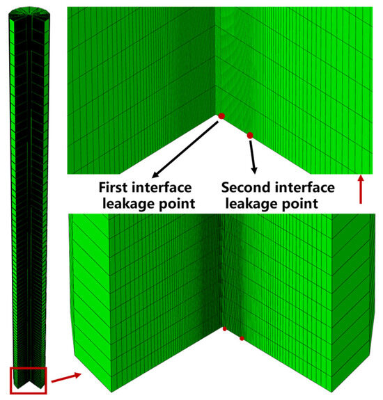 When the numerical model was established for analysis, it was assumed that the casing had no defects and the cement sheath was complete. The casing, cement sheath, and formation were all uniform isotropic. The thickness of the model cement sheath was 0.28 m. The formation thickness was 1.66 m. The model’s height was 50 m, as shown in Figure 12. The detailed parameters of the casing–cement sheath–formation are shown in Table 2. A cohesive unit was used to simulate the first and second cementing interfaces.