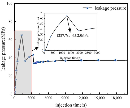 For the cement sheath–formation interface, in terms of initial parameter setting, the interface stiffness was 15 GPa. The interface normal cracking tensile strength was 0.86 MPa. The failure displacement was 0.001 m. As shown in Figure 14, when the CO2 injection time was 1287.7 s, the leakage pressure at the interface was 65.25 MPa. When the injection time was 4000 s, the interface leakage pressure remained basically unchanged. The interface crack expansion height was 1.36 m, and the expansion width was 3.22 mm.