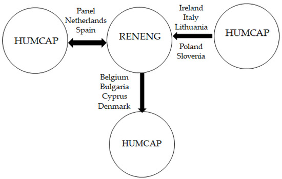 The panel-level causality analysis conducted on the relationship between HUMCAP and RENENG, as presented in Table 7 and Chart 3, reveals a bilateral causal connection between the two variables. However, the results of country-level causality analysis suggest a bilateral causality in the Netherlands and Spain; a unidirectional causal link from HUMCAP to RENENG in Ireland, Italy, Lithuania, Poland, and Slovenia; and a unidirectional causal link from RENENG to HUMCAP in Belgium, Bulgaria, Cyprus, and Denmark.