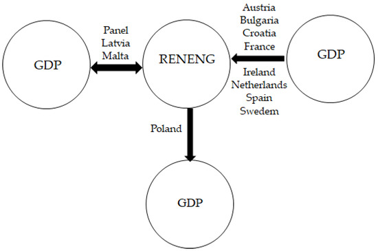 The panel-level causality analysis between GDP and RENENG in Table 8 and Chart 4 shows a bilateral causal relationship between GDP and RENENG. However, the results of the country-level causality analysis indicate a bilateral causality in Latvia and Malta; a unidirectional causal relationship from GDP to RENENG in Austria, Bulgaria, Croatia, France, Ireland, the Netherlands, Spain, and Sweden; and a unidirectional causal relationship from RENENG to GDP in Poland.