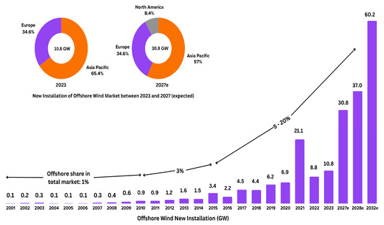 Wind power has become a widespread, affordable, and carbon-neutral RES. It can be produced at both onshore and offshore locations. However, modern wind farms are situated farther away from onshore electrical networks as they are built deeper into the sea, i.e., offshore. This shift has occurred for several reasons. First, the wind at offshore locations tends to be stronger and more consistent. Second, the onshore sites with substantial wind energy capabilities have already been used. Finally, the offshore wind farms (OWFs) have greater and more reliable wind energy potential [4]. In 1991, the Vindeby offshore wind power plant in Denmark served as a 5 MW demonstration project for 2200 households. At that time, the offshore wind market was confined to a smaller number of European countries. By 2024, Hornsea II, the world’s largest AC-connected OWF, will power 1.3 million homes with a total capacity of 1.386 GW, highlighting the global expansion of offshore wind [5]. The offshore wind market expanded by 27.8% per year on average from 2011 to 2020 [4]. Figure 1 depicts new offshore wind plants and their estimated market share from 2023–2032 [6].