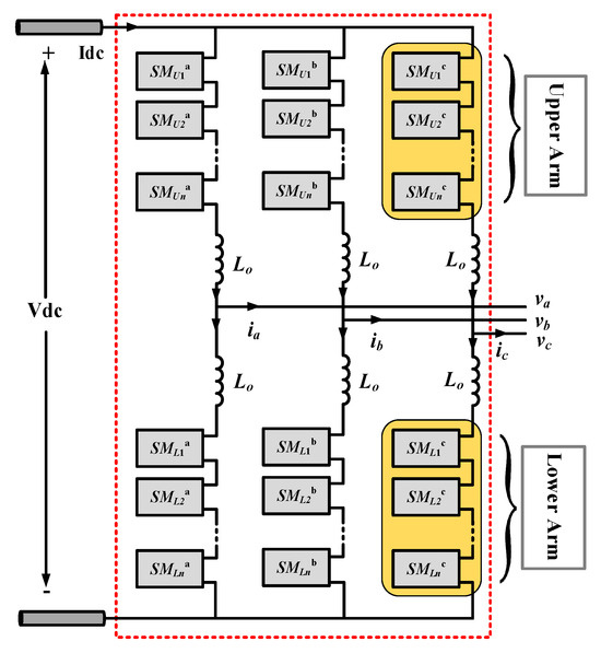 The modular multilevel converter (MMC), a type of VSC, was first created in 2003 by Professor Rainer Marquardt [27]. Because of its numerous advantages, such as modularity, scalability, increased reliability, transformer-less operation, and improved sine wave at the output [27,28,29], the MMC is a favored choice for HVDC applications. Moreover, inherently improved sine wave output allows the MMC to be operated without an output filter. Figure 2 shows the basic diagram of an MMC. One phase of an MMC consists of two arms: upper and lower arms. Therefore, in a three-phase MMC, there are six arms (both upper and lower) in total. All arms are identical in nature. The arm of an MMC has ‘N’ series-connected submodules (SMs), also known as cells, with an inductor L0. The main motivation for the use of the inductor L0 is to reduce the short circuit and circulating current (CC) in the MMC. The SMs or cells are identical. Each of them can be either a half-bridge submodule (HB-SM) or a full-bridge submodule (FB-SM). The HB-SM is given preference in MMC-HVDC projects due to its higher reliability and efficiency. The Trans Bay Cable project (±200 kV/400 MW), which connects Pittsburgh, Pennsylvania, and San Francisco, California, is the first MMC-HVDC link in history to use an HB-MMC [28].