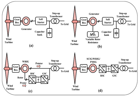 Wind turbine technologies: (a) Type I Fixed Speed Wind Turbine, (b) Type II Variable Speed Wind Turbine, (c) Type III Wind Turbine, (d) Type IV Wind Turbine [32].