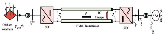 One of the techniques to solve the issue of the power imbalance between two converter stations and thus the DC link overvoltage problem is the dissipation of the excessive power through a dedicated circuit called an energy-diverting converter (EDC) or dynamic braking resistor (DBR), which is popularly known as a chopper. This FRT technique for the OWF MMC-HVDC system is based on a simple control strategy that is activated when the DC link voltage exceeds the setpoint. The chopper can be either a DC chopper or an AC chopper. The FRT scheme based on the implementation of a chopper has been well described in [51]. Figure 4 shows an OWF MMC-HVDC system with a DC chopper installed at the onshore DC side.
