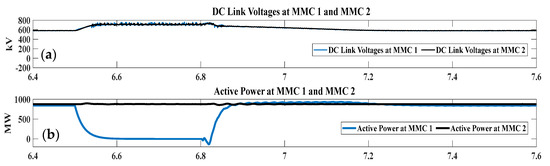 (a) DC link voltages at MMC converter stations 1 and 2. (b) Active power at MMC converter stations 1 and 2 [4].