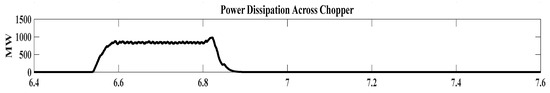 The primary benefit of this technique is that it can maintain a steady DC voltage quickly. For example, a study performed on a ±580 kV, 850 MW MMC-HVDC system in [4] shows that when a fault at the onshore AC side occurs at t = 6.5 s, the active power at the onshore MMC1 converter station side becomes zero as shown in Figure 5b [4], while the active power supplied from the OWF through MMC2 remains unaffected. This active power from the OWF is dissipated in the DC chopper as shown in Figure 6 to avoid a power imbalance between the sending and receiving sides, thus keeping the DC link voltage within the safe limit quickly without affecting the WT output power. After the fault is cleared at t = 6.8 s, the DC link voltages return to the pre-fault value of 580 kV.