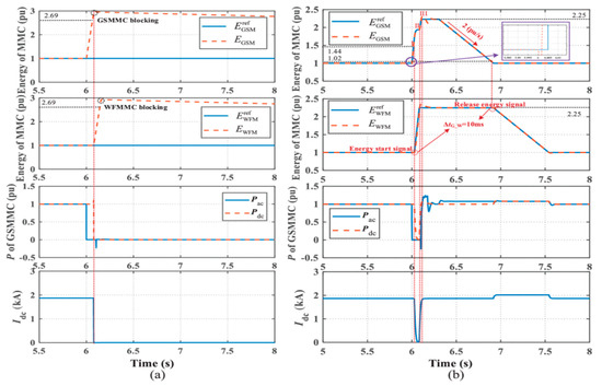 Apart from the aforementioned FRT techniques for onshore-side AC faults, the current research trend is to utilize the internal capacitance of MMC SMs to solve the DC link overvoltage issue by absorbing excessive energy when any fault occurs on the onshore side. Using this concept, a communication-free, additional-device-free energy optimization control scheme is proposed in [73], in which the MMC-HVDC system’s energy storage capacity has been utilized to store the excessive energy during the fault, taking into account the grid-forming and grid-following controls on the onshore MMC. The proposed FRT scheme has been tested on the RTDS simulation platform. Reference [18] proposes a multistage sequential network energy control strategy to ride through offshore AC asymmetrical faults. By using the parameters of the Shantou-Zhongpeng II (China) OWF project, active energy control (AEC) based on the decoupling of the sub-module capacitor voltage and DC voltage is proposed in [74] for AC FRT without any additional device such as a DC/AC chopper. Figure 9 [74] shows how AEC implementation affects the energy variation characteristics of the grid-side MMC (GSMMC) and wind farm-side MMC (WFMMC). Without AEC, the energy of the GSMMC rises rapidly when AC fault occurs. The converter station will be blocked when the sub-module (SM) voltage exceeds the threshold. However, with AEC, the grid-side MMC (GSMMC) receives the fault signal within 5 ms and thus starts the AEC process. With the fault duration of 100 ms, both the GSMMC and WFMMC energy reach a maximum value of 2.25 P.U. Therefore, the AEC scheme can aim for a time of around 100 ms under severe fault while suppressing the surplus power.