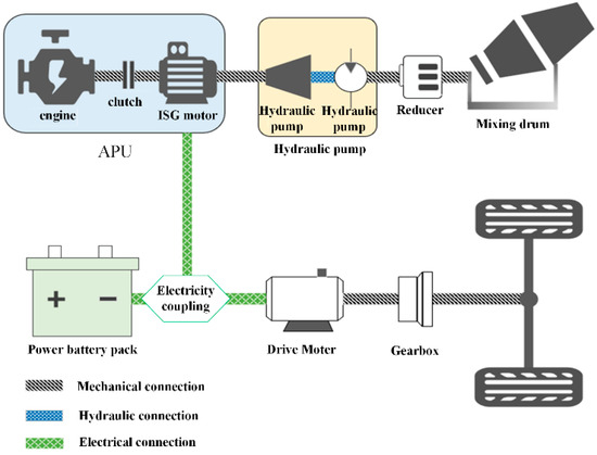 The powertrain model of the extended-range concrete mixer truck is shown in Figure 1. The extended-range concrete mixer truck is mainly composed of the power battery pack, APU, drive motor, gearbox, hydraulic transmission system, reducer and mixing drum. Compared to hybrid vehicles, extended-range concrete mixer trucks have two power consumption units—drive motor and mixing drum [30,31]—which makes the powertrain more complex. There are two power sources in the extended-range concrete mixer truck: the battery pack as the main power source and the APU as the auxiliary power source. When the vehicle is operating, the battery pack and the APU together provide the energy required by the drive motor and the mixing drum. The APU is composed of engine, integrated starter and generator (ISG) and clutch. The engine is a diesel engine with good power and reliability and the ISG is a three-phase permanent magnet synchronous motor (PMSM). The configuration of the engine and ISG is shown in Table 1 and Table 2.