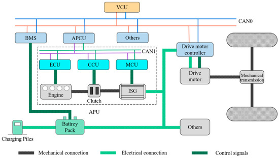As Figure 2 shows, the architecture of the whole vehicle’s control system is multi-layer and distributed. The top layer is the VCU, which is the core of the control system. The middle layer includes a battery management system (BMS), APCU and others, and receives the command signals from the VCU, coordinates the internal operation of each subsystem, and feeds back the status signals of each subsystem in real time. The bottom layer is the control units of actuators, which are also the controllers closest to the mechanical components, mainly including the engine control unit (ECU), ISG control unit (GCU) and clutch control unit (CCU). The function of the bottom layer is to receive the signals from the middle layer controllers and control the operating states of the actuators. Data are transmitted via CAN bus.