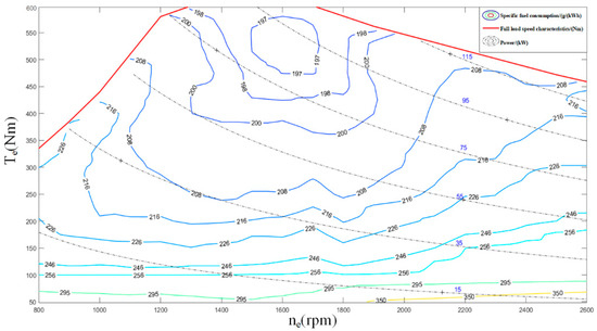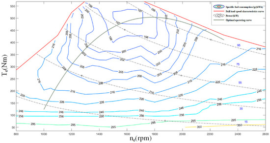 According to the experimental data of the engine, the engine fuel consumption map is expressed as shown in Figure 3. The full load speed characteristics curve indicates the maximum torque corresponding to different engine speeds at maximum power.