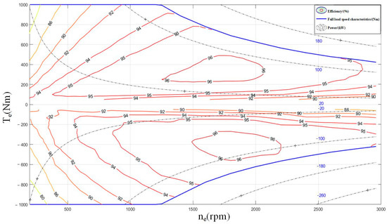According to the experimental data of ISG, the ISG efficiency map is expressed as shown in Figure 4. Figure 4 is divided into two parts according to the positive and negative torque. In the upper part, ISG operates at the electric mode and in the lower part it operates at the power generation mode. The full load speed characteristics curve indicates the maximum torque corresponding to different ISG speeds at maximum power.