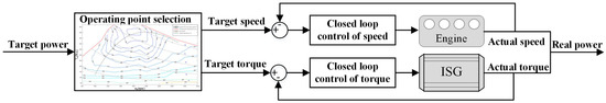 The coordinated control strategy of APU is shown in Figure 6. Firstly, the target generation power is determined, and then the target power is decoupled into target speed and target torque according to the optimal fuel consumption curve of the APU. The engine and ISG are controlled by control algorithm in a dual closed loop, respectively. This strategy provides dual closed-loop control of the engine and ISG to achieve a fast and stable response of speed and torque to target values. For the dual closed-loop algorithm, the difference between engine target and actual speed and ISG target and actual torque are the inputs and the actual speed and torque are the outputs.