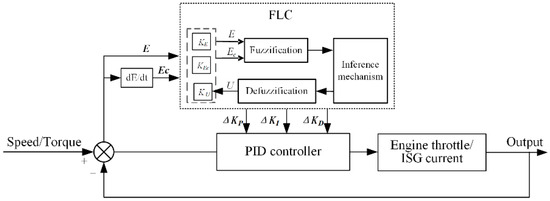 The traditional incremental PID control algorithm can achieve power tracking, but its steady-state and transient performance is still poor. Fuzzy PID is the combination of fuzzy control and PID control, which has the advantage of strong stability. To achieve a fast and stable tracking to the target power and improve APU efficiency, we utilize fuzzy PID algorithm for dual closed-loop control of speed and torque. As Figure 7 shows, the error E and the differential error d E / d t of the engine speed and ISG torque are inputs, and through inference and calculation of the fuzzy logic controller (FLC), the correction coefficients Δ K P , Δ K I and Δ K D are outputs to the PID controller for adjustment of PID parameters. In Figure 7, K E and K E c are quantification factors of the error and differential error, respectively. K U is the scale factor.
