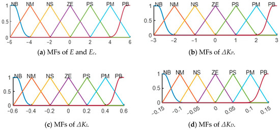 The inputs of the FLC are E and d E / d t of speed/torque and the outputs are correction coefficients Δ K P , Δ K I and Δ K D . Considering that the fuzzy PID controller has 2 inputs, the two-dimensional FLC is used. The continuous variables of inputs are converted to fuzzy variables in the discrete universe by (5):
