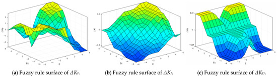 Fuzzy rules are the core of FLC. According to the role of control parameters in the system, we designed the fuzzy rules for Δ K P , Δ K I and Δ K D , as shown in Table 3, Table 4 and Table 5. The fuzzy rules surfaces are shown in Figure 9.