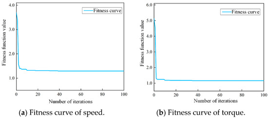 Writing PSO algorithm in MATLAB (R2021a) and joint simulation with fuzzy PID controller model in Matlab/Simulink (R2021a). The number of particles is set to 20. w = 0.6. The maximum number of iterations is 100, and the learning rates c 1 = c 2 = 2 . The fitness function curves of the controller for speed and torque are shown in Figure 11. From Figure 11, we know that the fitness function value of the speed obtains the optimal solution at the 39th iteration, with the value of 1.293. The optimized parameters are as follows: E = 3.5, Ec = 0.75, ∆KP = 11.8103, ∆KI = 0.1833, ∆KD = 0.0558; the fitness function value of the torque obtains the optimal solution at the 35th iteration, with the value of 1.162. The optimized parameters are as follows: E = 1.5, Ec = 0.2, ∆KP = 2.0225, ∆KI = 0.2334, ∆KD = 0.1065.