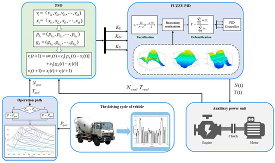 In [22], a cascade PID-based controller was established to control the speed and torque of the powertrain; the results show that the method has a high control accuracy. Taking the minimum fuel consumption as the control goal, Barsali et al. [23] used a fuzzy prediction algorithm to control the engine speed to make it operate at the optimal operating curve. Darwich et al. [24] used a PSO algorithm to solve the optimal problem of nonlinear system; the engine speed and generator torque are optimized through the global exploration ability of particle swarms to achieve efficient control of the APU.