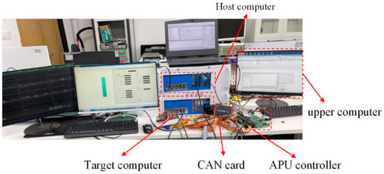 The HIL test platform is shown in Figure 13. It mainly consists of the real-time system, upper computer software and APU controller. The chip of APU controller is XC2267M, manufactured by Infineon in Munich, Germany. Connect the actual controller to the simulation platform. The real-time system simulates the operation state of the APU and the signals are transferred among the upper computer, controller and real-time system through a CAN bus. The HIL system runtime is synchronized with real time, so it can accurately reflect the control effect of the control strategy.