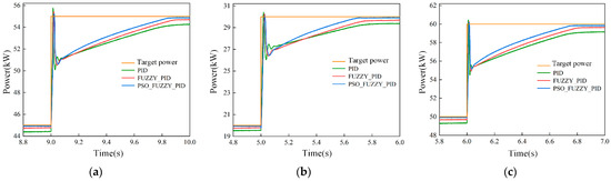 Figure 15. Target power tracking effect of three control strategies under different transitional conditions: (a) 45–55 kW in working condition 1; (b) 20–30 kW in working condition 2; (c) 50–60 kW in working condition 3.