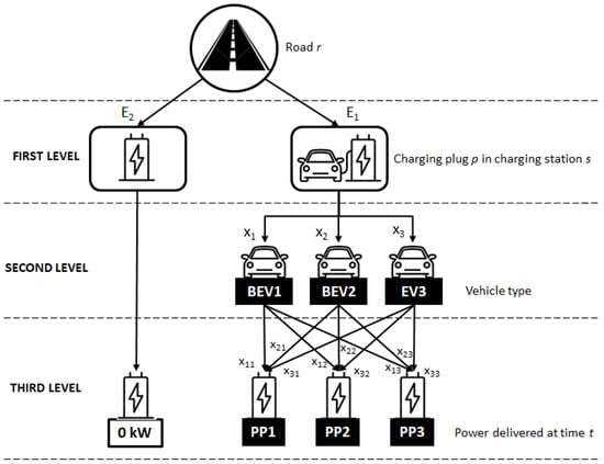 The estimation of the power demand of a CP at a determined station is based on a three-level probability scheme (Figure 2). This hierarchical structure allows for the classification of the power demand of a CP in a specific time slot. To achieve more accurate results, one hour is divided into three 20 min time slots (TSs). This time slot duration is suitable considering the average power supplied to the vehicle and 5 min of plug operation. In these conditions, it is possible to gain over 60 km of vehicle range in the worst-case scenario.