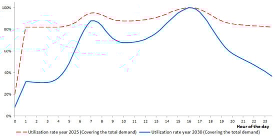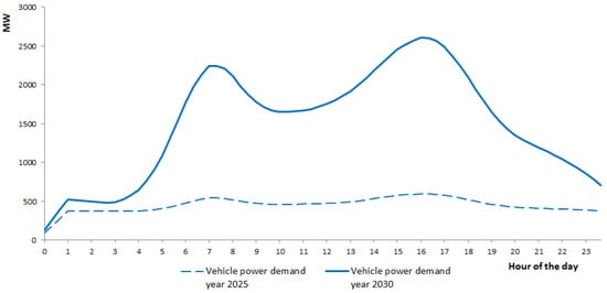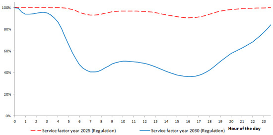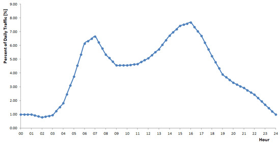 The hourly traffic intensity distribution (KIH(t)) used (see Figure 3) is based on a typical hourly variation in traffic volume suggested by the Traffic Monitoring Guide of the U.S. Department of Transportation [48]. This graph shows the typical evening peak hours on road routes during weekdays. The is estimated using the annual data provided by the Spanish Ministry of Transport [49]. Furthermore, the value is projected for future years using the yearly total fleet estimation.