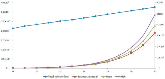 The proportion of BEVs in the traffic flow (C1b) is estimated through the market share of this type of vehicle in the Spanish fleet. The BEV share estimation is determined using a logistic growth function fit [50,51], considering a total fleet size in Spain of 32.7 million vehicles in the year 2030.