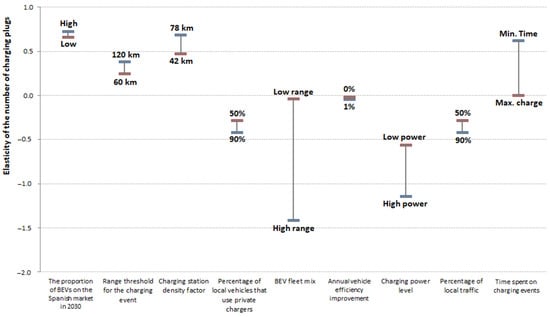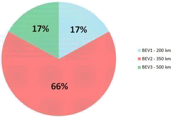 This study distinguishes among three categories of BEVs according to the driving range and the power charging capacity (Table 1). The BEV fleet mix variation aims to depict the relative adoption rates of short- and long-range BEVs expressed with the probabilities xi. For instance, in the reference scenario, the range specifications of the BEVs correspond to the vehicles sold in recent years and those available for sale in the current market [55]. In this scenario (Figure 5), there is a preference for BEVs with a driving range of 350 km. This situation corresponds to the market share segmentation by range realized based on the data provided by the DGT statistics [52]. Accordingly, the values of the probabilities are x1 (17%), x2 (66%), and x3 (17%). During sensitivity analysis, a scenario with a preference for shorter ranges is considered, with a predominance of BEVs with a driving range of 200 km, while the long-range sensitivity entails BEVs with a driving range of 500 km as the most preferred option on the market.
