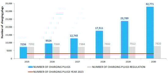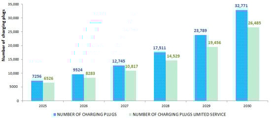 However, the authors do not consider queues. Instead, it is assumed that charging stations can accommodate all types of demand. Accordingly, the number of charging plugs per charging station s (CPs) is determined by the maximum number of charging plugs delivering power in a specific TS t in a day (Equation (21)).