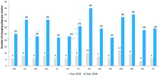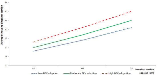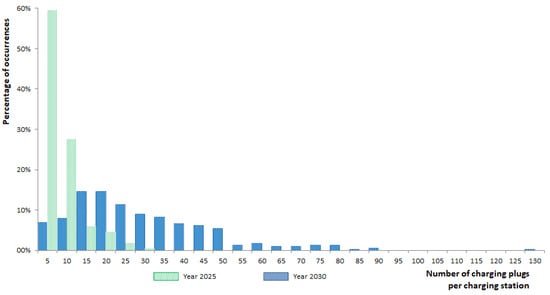 The study by ICCT [42] suggests a proportion of 250 BEVs per DCFC for nonmetropolitan areas by 2030. The investigation shows a ratio of 119 BEVs per DCFC device. The result is consistent because the ICCT study includes plug-in electric vehicles with a battery capacity significantly lower than that of a BEV. But once again, if compared with a petrol station, the average efficiency of a petrol pump is around 20 vehicles per hour, this translates into 3 min per vehicle. Nevertheless, with DC fast chargers, it is possible to obtain an average of 50 kWh in 15 min; this could be equivalent to 15 min per vehicle in the best-case scenario. Otherwise, to fulfill a demand of 20 vehicles per hour, we only need one petrol pump but five DC fast chargers. The analysis carried out in this study proposes a total of 32,771 recharging plugs with an average of 30 chargers per service station, which would translate into approximately six petrol pumps, obtaining a meaningful result.