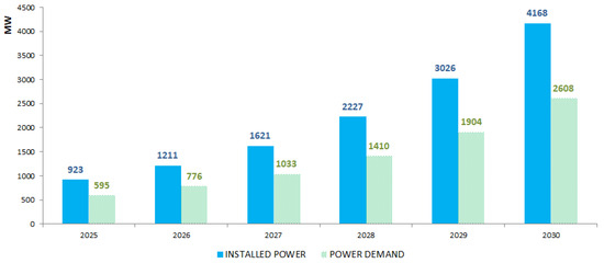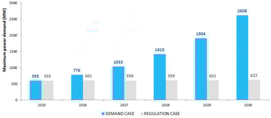 The reference scenario considers the guidelines of European regulation 2023/1804. In this sense, road traffic corridors should have charging stations available for light BEVs, in each direction of travel, with a maximum distance of 60 to 100 km between them depending on the average daily traffic flow on the road. Each CS should meet the following minimum requirements by no later than 2035: (i) available power of at least 600 kW and (ii) inclusion of at least two DCFC plugs with an individual power availability of at least 150 kW. However, to analyze the effect of CS density on power demand, two sensitive cases of coverage index (Δ(RCSr)), either 30% worse or better than that proposed by the regulations, have been proposed.