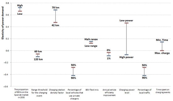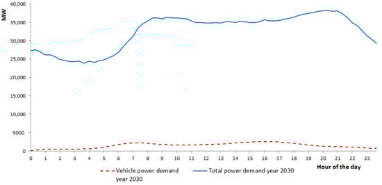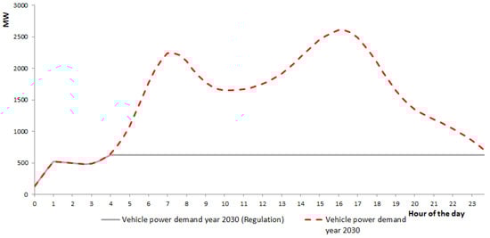 Moreover, the percentage of local vehicles that use the private charging infrastructure is considered with a value of 70% for the base case; meanwhile, the optimistic and pessimistic cases feature 90% and 50%, respectively. The base case is established using the number of vehicles that do not have access to a private parking space. According to INE data [54], there exist around 10 million private parking places; therefore, if the Spanish BEV fleet in the year 2030 reaches 4.9 million vehicles, it is reasonable to consider that over 50% of battery electric vehicles will have the option of scheduled charging. The optimistic case is aligned with the value used in other studies [29,42].