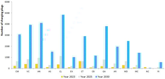 Currently, Spain has the fourth largest passenger vehicle fleet in Europe, with over 26 million light-duty vehicles (LDVs) on the road at the end of 2022 [1]. Nevertheless, there exist only around 110,000 electric private cars [2], representing 0.5% of the light-duty vehicle fleet. The growth rate of electric vehicles in Spain is slower than that in other European countries, with a new passenger car registration share of near 4% in 2022. The Spanish Integrated National Energy and Climate Plan 2021–2030 (PNIEC), as part of the European Union (EU) energy and climate targets for 2030, has established the objective of achieving a fleet of 5 million electric vehicles (EVs) and 500,000 charging spots in Spain by 2030, with a 100% share of new LDV registrations composed of EV by 2040 [3].