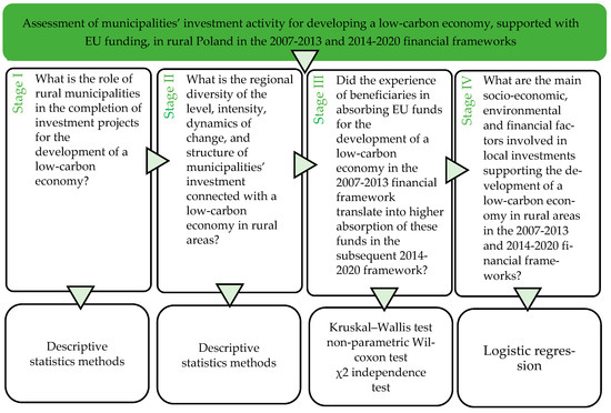 Achieving the main goal of the research project and answering the research questions required the study to be conducted in four stages (Figure 1). Stage one involved showing the role of rural municipalities in obtaining EU funds for a low-carbon economy in comparison with the other types of municipality. To this aim, selected methods of descriptive statistics were used. They were also used in stage 2, which involved an analysis of the diversity of the level, intensity, dynamics and structure of municipality low-carbon economy investments in rural areas in a regional approach. Due to a suspicion that the local governments in the study were much more active in the 2014–2020 financial framework compared to the years 2007–2013, stage 3 focused on verifying the significance of the beneficiary experience. Thanks to the Kruskal–Wallis test, the distribution of selected features reflecting investment activity was checked first. Once the hypothesis of its normality had been rejected, the non-parametric Wilcoxon test for a dependent variable was calculated for two moments in time (2007–2013 and 2014–2020). This test helps compare data gathered before and after an experiment in order to find out if a statistically significant change has occurred. The test checks the equality of medians and may be used in situations when the assumptions of Student’s t-distribution test are not fulfilled [43]. It is a nonparametric test, so it can be used even when the data are asymmetric or do not meet the normality requirement. The Wilcoxon test is more resistant to deviations from normality, because instead of the values of the data themselves, it is based on the ranks of the data. Thanks to this, it is not sensitive to unusual values (outliers) [43]. In addition, the significance of the correlation between two qualitative features was checked using the χ2 independence test. This is the most popular nonparametric test serving to verify hypotheses on variable independence or the compatibility of a distribution with the assumptions.