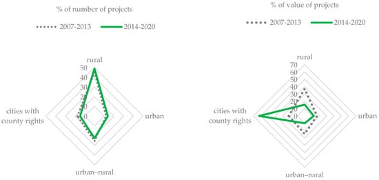 Structure of EU low-carbon economy projects implemented by municipalities, by type of administrative unit, in Poland in the 2007–2013 and 2014–2020 financial frameworks. Source: own work, based on data from the Ministry of Development Funds and Regional Policy [39,40].