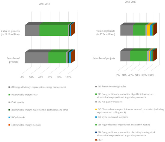 Structure of Polish rural municipality projects supported with EU funds for a low-carbon economy, by intervention area, in the 2007–2013 and 2014–2020 financial frameworks. Source: own work, based on data from the Ministry of Development Funds and Regional Policy [39,40].
