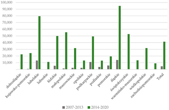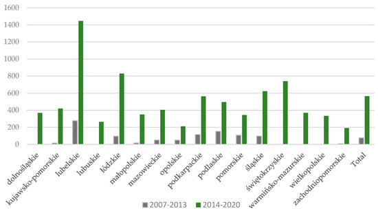 Regional diversity of the per capita value of projects obtained by rural municipalities in Poland in the 2007–2013 and 2014–2020 financial frameworks (in PLN). Source: own work, based on data from the Ministry of Development Funds and Regional Policy [39,40].