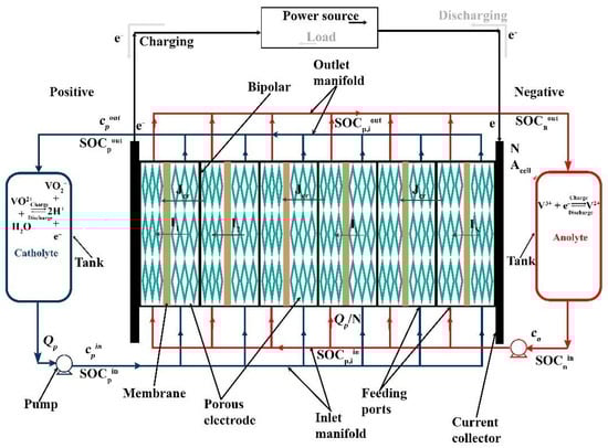 The term “redox” refers to chemical reduction and oxidation reactions utilized by the RFB to store energy in liquid electrolyte solutions that flow through electrochemical cells during charging and discharging. The RFB system is made up of “stacked” individual cells with ion-exchange membranes that physically separate the electrolytes, avoiding species crossover but allowing for selective ion conduction to maintain the charge balance during operation [3,4]. Discharge is characterized by the release of electrons from the electrolytes into the circuit to perform useful work. Conversely, during charging, the reverse reaction captures electrons from an external power source to replenish the energy potential. The passive state of charge (SOC) balance subsists in both directions. The term SOC refers to the degree of charge (available energy) of an electrical battery relative to its maximum capacity.