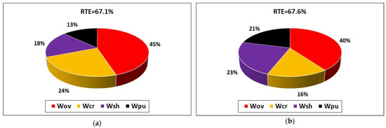 Comparison of the breakdown of energy loss between (a) experimental data and (b) simulated results for a charge/discharge cycle at 50 A for the 40-cell VRFB system investigated by Trovò et al. [18].