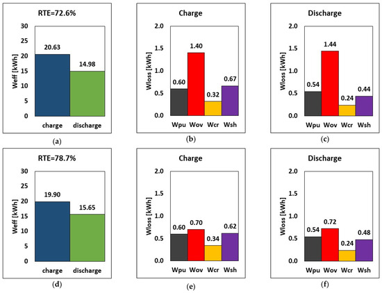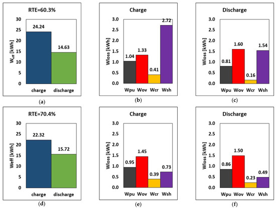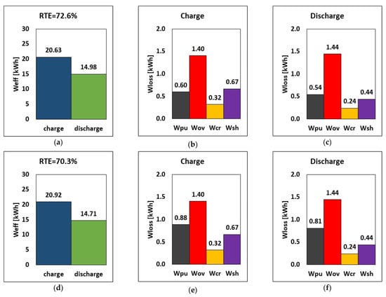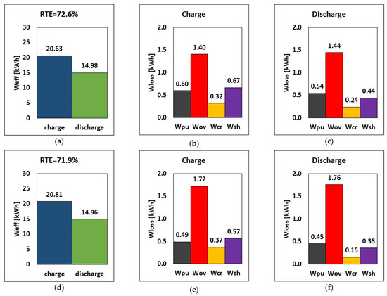 RTE, energy, and breakdown of energy losses during charge and discharge at (a–c) 60 mm and (d–f) 20 mm manifold diameters, at I = 50 A and Q = 25 L/min.