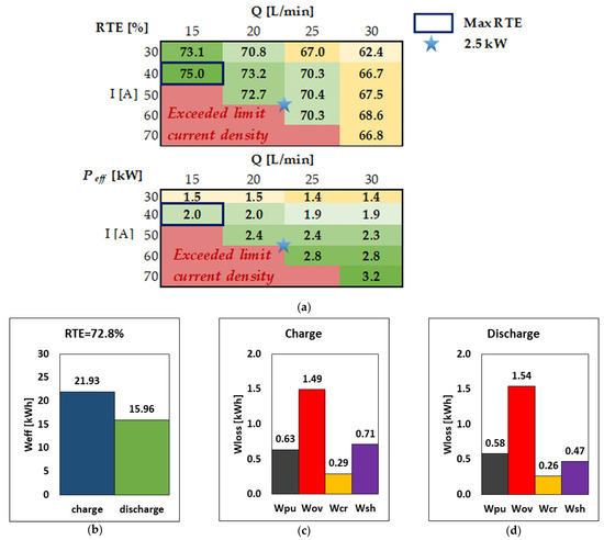 Figure 5a shows that the maximum RTE, equal to 75%, is obtained at 40 A and 15 L/min, corresponding to an effective discharge power of 1.99 kW, marked with a blue box. Such a rated power is acceptable for some domestic use of RFBs [18,33,34,35], although one may want a system with higher power, e.g., 2.5 kW, which is denoted with a light blue star. More specifically, the 2.5 kW operation point corresponds to 51.5 A and 20.5 L/min, with an RTE of 72.8%, which is only marginally smaller than the maximum RTE identified above. Therefore, the nominal operation point of such a VRFB system can be considered to be the one indicated by the light blue star, corresponding to a nominal effective discharge power of 2.5 kW.