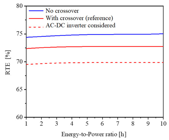 One of the favorable characteristics of RFBs is that energy and power can be easily decoupled by independently changing the tank and stack sizes, respectively, in order to achieve the desired nominal energy-to-power ratio. As shown in the previous section, the VRFB system under consideration can be operated at a nominal discharge power of 2.5 kW to deliver 15.96 kWh using tanks of 550 L each. This allows for 6.4 h of the nominal energy-to-power ratio. In this section, while the stack size and operating conditions are kept the same as indicated in the previous section, different tank sizes are explored to analyze the effect of the energy-to-power ratio on the RTE. In particular, the larger the tank size, the larger the amount of electrolyte stored in the system, thus resulting in higher capacity and higher energy theoretically stored in the tanks, with a corresponding increase in charge and discharge times.