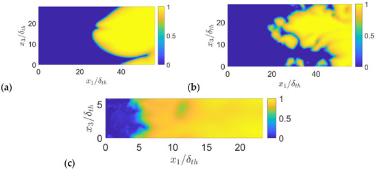 The distributions of non-dimensional temperature in the central mid-plane for cases A–C are shown in Figure 1a–c. Figure 1a shows that the isosurfaces of are parallel to each other in case A, which is expected in the flames within the corrugated flamelet regime where turbulent eddies cannot enter into the flame. By contrast, the isosurfaces of are not parallel in case C and the isosurfaces representing the preheat zone in this case are found to be more wrinkled than the isosurfaces representing the reaction zone. This implies that small turbulent eddies penetrate the preheat zone in case C, as expected for large Karlovitz number (i.e., ) Flames. The non-dimensional temperature distribution of case B shows some attributes of case C because is also valid for case B. The behaviour of case B is intermediate between cases A and C. A detailed discussion of distribution in these flames has been provided elsewhere [32], which is not repeated here for the sake of brevity.