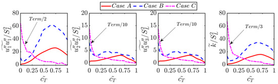 The variations of , with for cases A, B and C are shown in Figure 3. Similar to Reynolds stress components, assumes greater magnitudes than and . Thus, remains the major contributor to for all cases considered. Similar to Reynolds stress component variations within the flame brush, , and for cases A and B increase and decrease through the flame brush, while for case C they decrease monotonically.